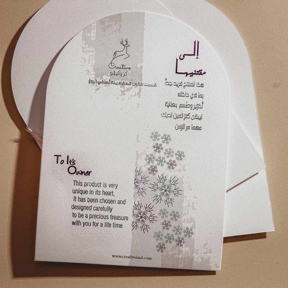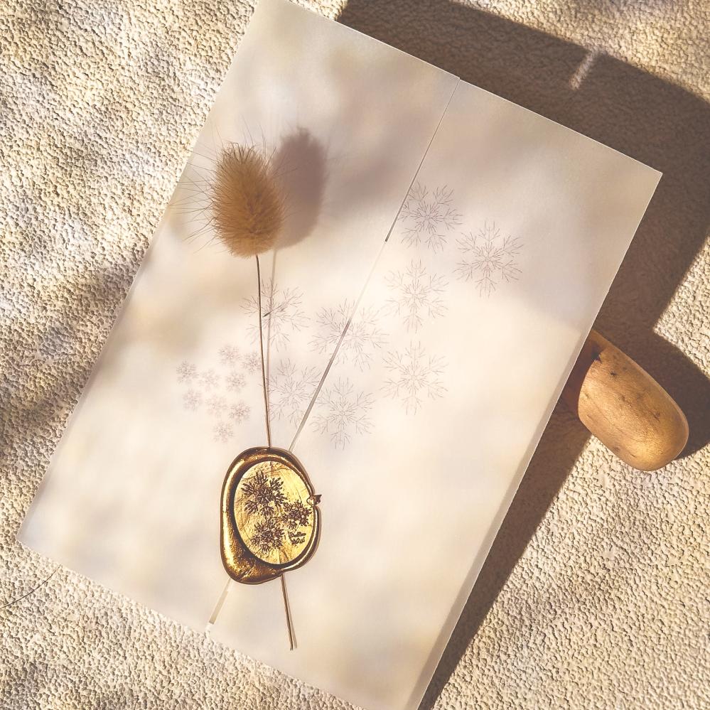 - A snowflake-adorned envelope holds a luxurious card, featuring an engraved design of your choosing and embellished with a rabbit's tail branch and a wax seal.